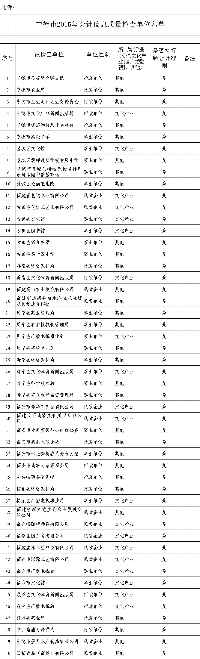 全市共有50家企业和行政事业单位,列为2015年会计信息质量检查对象,具体名单详见附件。